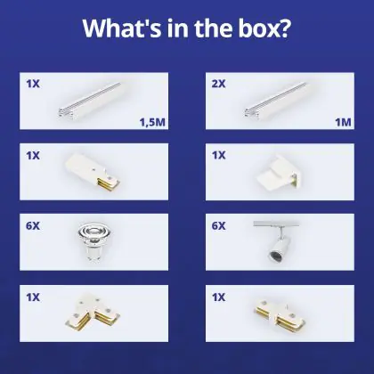 | Herstellername | Complete L shaped 1-Phase Track Set White incl. 6x Spot fixture + GU10 2700K 3W Dim – 1.5 x 2 meters | |