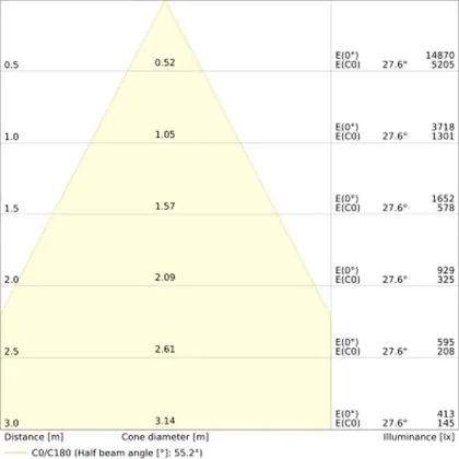 Der Abstrahlwinkel bezeichnet den Winkel, in dem das Licht aus der Lichtquelle ausgestrahlt wird. Er wird in Grad (D) angegeben. Je geringer die Gradzahl des Abstrahlwinkels ist, desto kleiner ist auch der Durchmesser des Lichtkegels, den die Lichtquelle produziert. Beispiel: Wird eine Lampe mit einem Abstrahlwinkel von 60 Grad an der Decke (2,5 m Höhe) angebracht, erzeugt sie einen Lichtkegel von 2,9 Metern Durchmesser. Hat die Lampe hingegen einen Abstrahlwinkel von 120 Grad, beträgt der Lichtkegel 8,7 Meter im Durchmesser. |