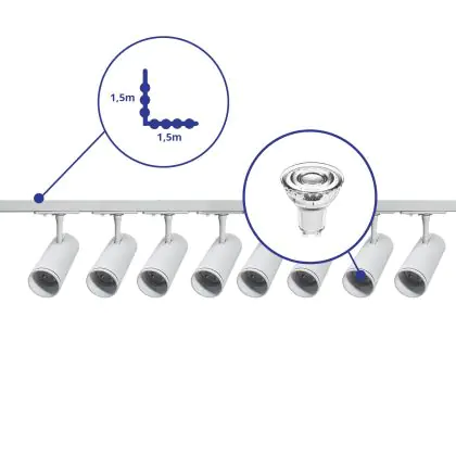 | Nom du fabricant | Complete L shaped 1-Phase Track Set White incl. 8x Spot fixture + GU10 2700K 3W Dim – 1.5 x 1.5 mete | |
